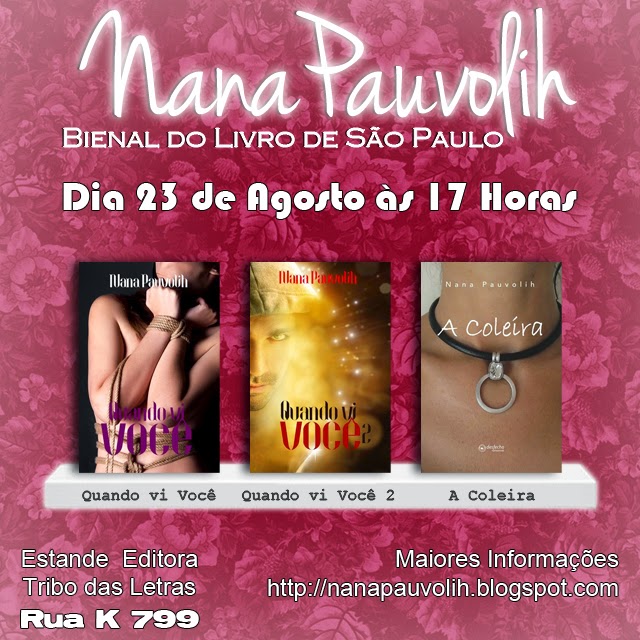 Às 17 horas Nana Pauvolih estará presente no estande da Editora Tribo das Letras, onde serão vendidos os livros, incluindo "A Coleira", primeiro livro da autora lançado por uma grande editora.